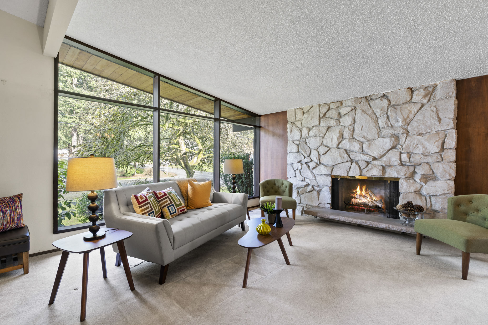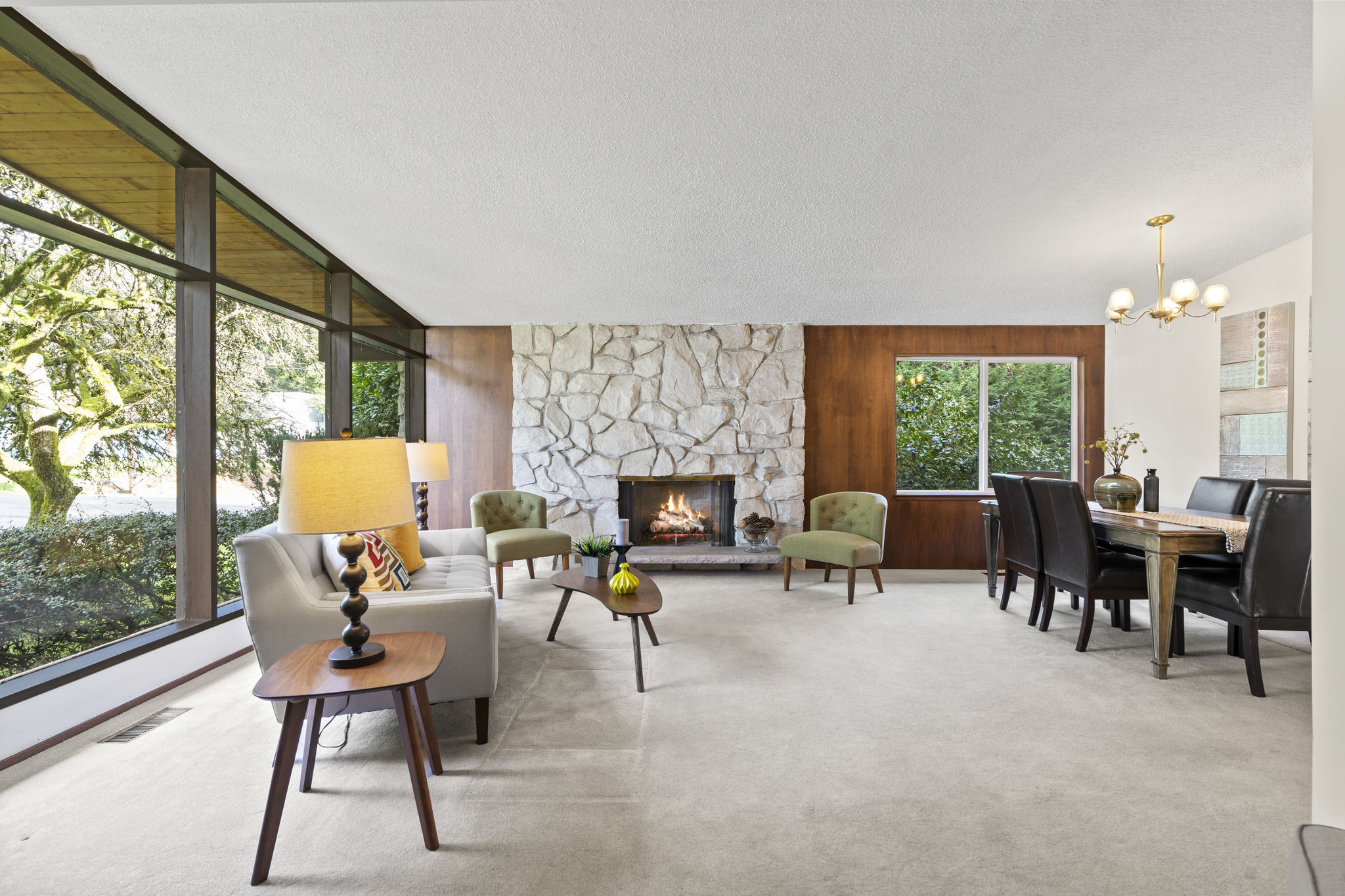 {{Quintessential mid-century modern}} This 3010 sqft home maintains many of its original features, including beautiful architectural colored glass room dividers, a feature stone fireplace, stone floors, & light fixtures. Updated kitchen w/quartz countertops, a pull-out pantry, & an eating nook. 4 beds & 3 baths, mudroom + den. This home boasts a 1300 sqft finished basement, a great space for a media or games room. With a two-car basement garage, 2 vehicle carport + space for an RV. Large 8967 sqft lot. Nestled in a quiet bedroom community with easy access to the 522 and Seattle. The Popular Lake Forest Park area is convenient to a plethora of parks, the Burke Gilman Trail, & its wonderful views across the lake. Make it home today!