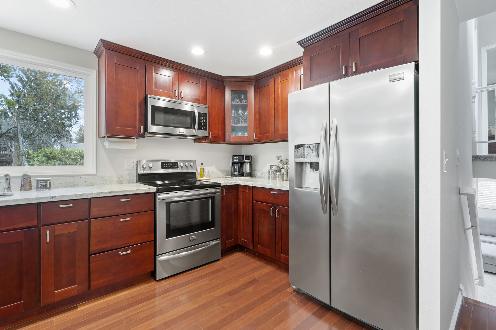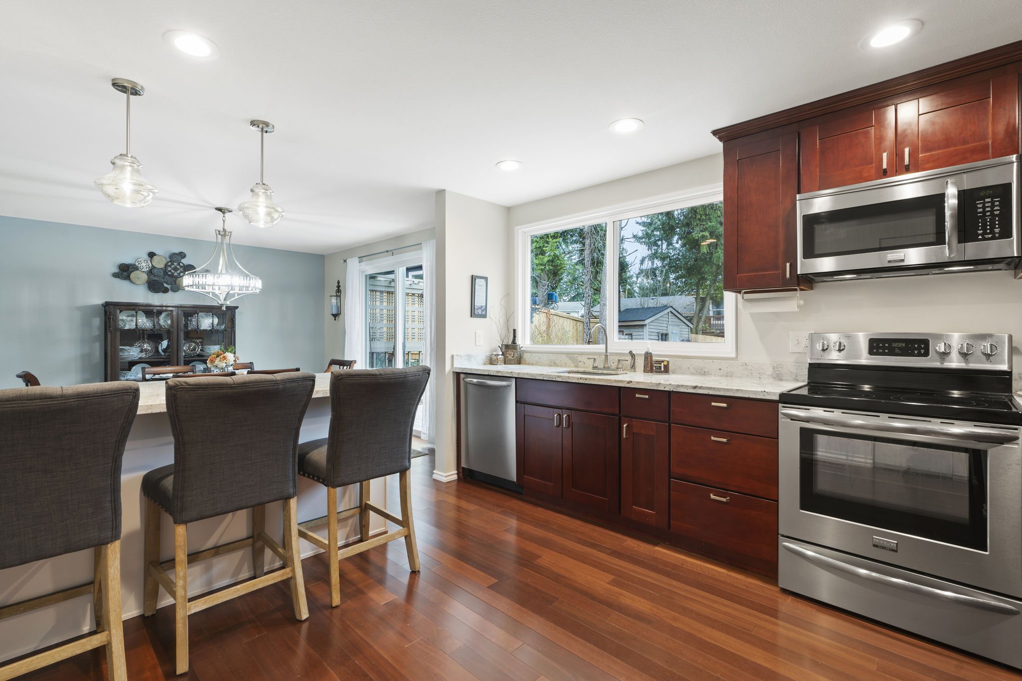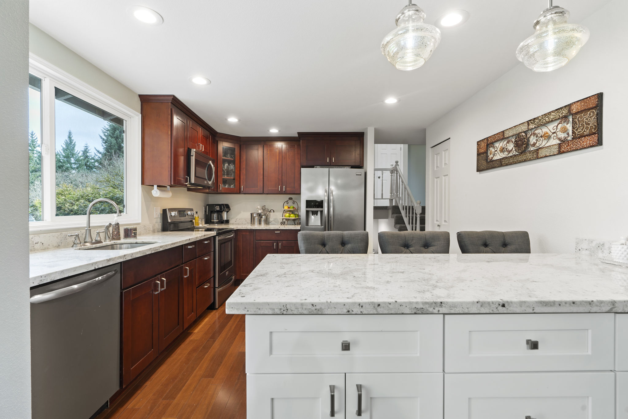 {{Desirable Finn Hill location}} -Easy access to Kirkland & Freeways. Well maintained warm & inviting Tri-level home w/open floor plan. Light + sunny windows. Updated kitchen w/ cherry floor & cabinets, stone countertops w/ breakfast bar makes a great space to entertain. 3-bedrooms featuring primary w/ en-suite bathroom plus walk-in closet has partial mountain view, updated bathrooms, generous rec/media room on the lower level as well as combined laundry/powder room. With many newer features including carpets, roof, interior-exterior paint this home is a must-see. Beautiful mature gardens that bloom with vibrant color, included in this space is a deck with privacy screen, new fence, and patio with hot tub that stays! Make it home today.